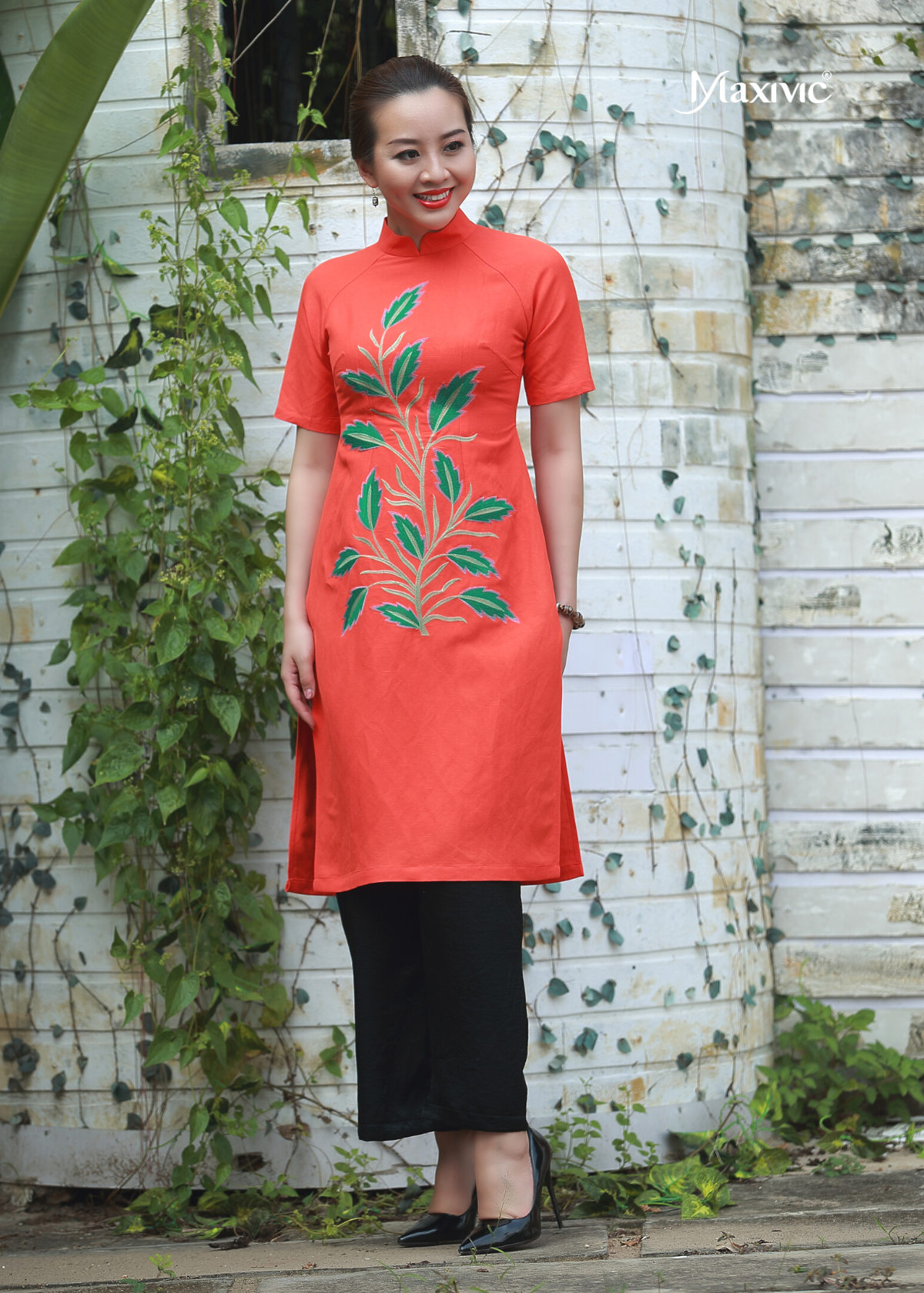 Áo Dài Linen Cam kiểu dáng cách tân, cổ trụ tay ngắn thêu lá trước ngực. Phom áo ôm vừa mang đến sự uyển chuyển, dịu dàng cho người mặc.