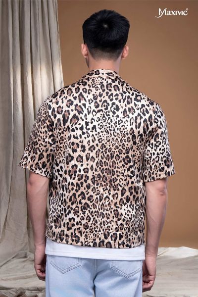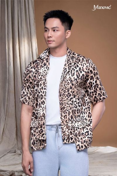 - Áo sơmi tay ngắn hoạ tiết da beo, tà áo sole có túi, mang lại vẻ ngoài phóng khoáng và trẻ trung cho người mặc