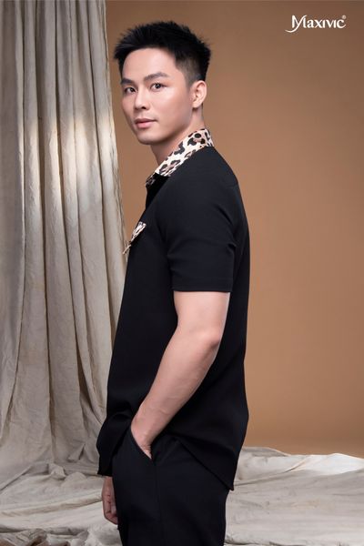 - Áo sơmi đen tay ngắn, cổ và nắp áo phối hoạ tiết da beo mang lại vẻ ngoài phóng khoáng và trẻ trung cho người mặc