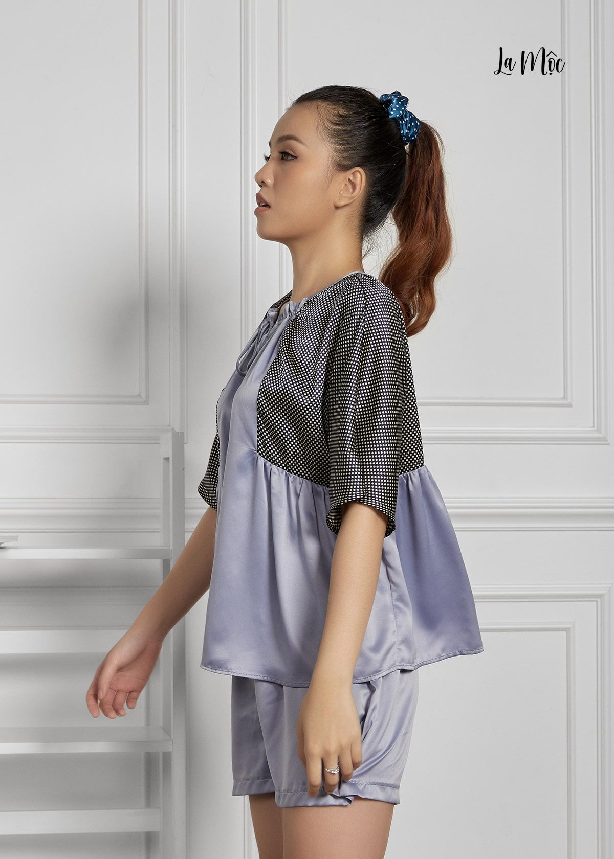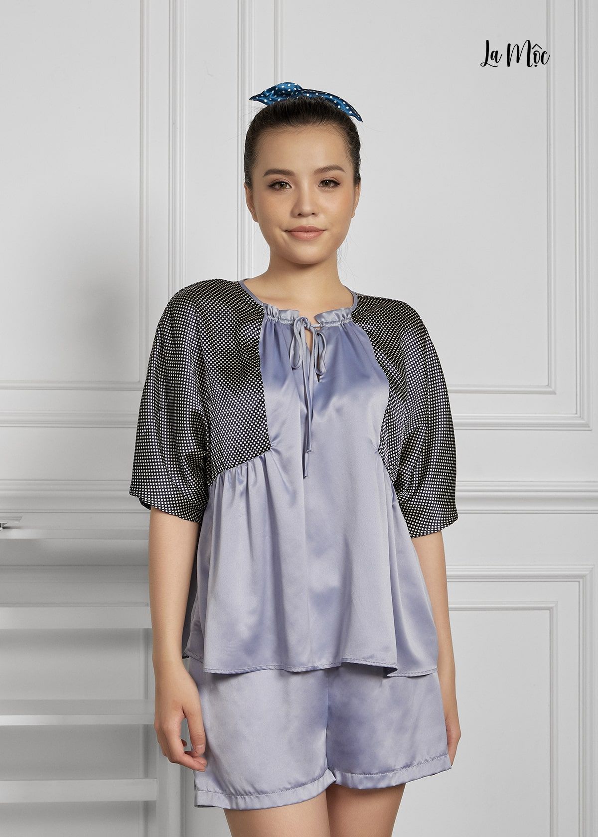 Bộ mặc nhà ngắn xanh nhạt phối họa tiết chấm bi xám. Dáng áo xòe, thắt nơ cổ áo kết hợp nhún chân ngực.